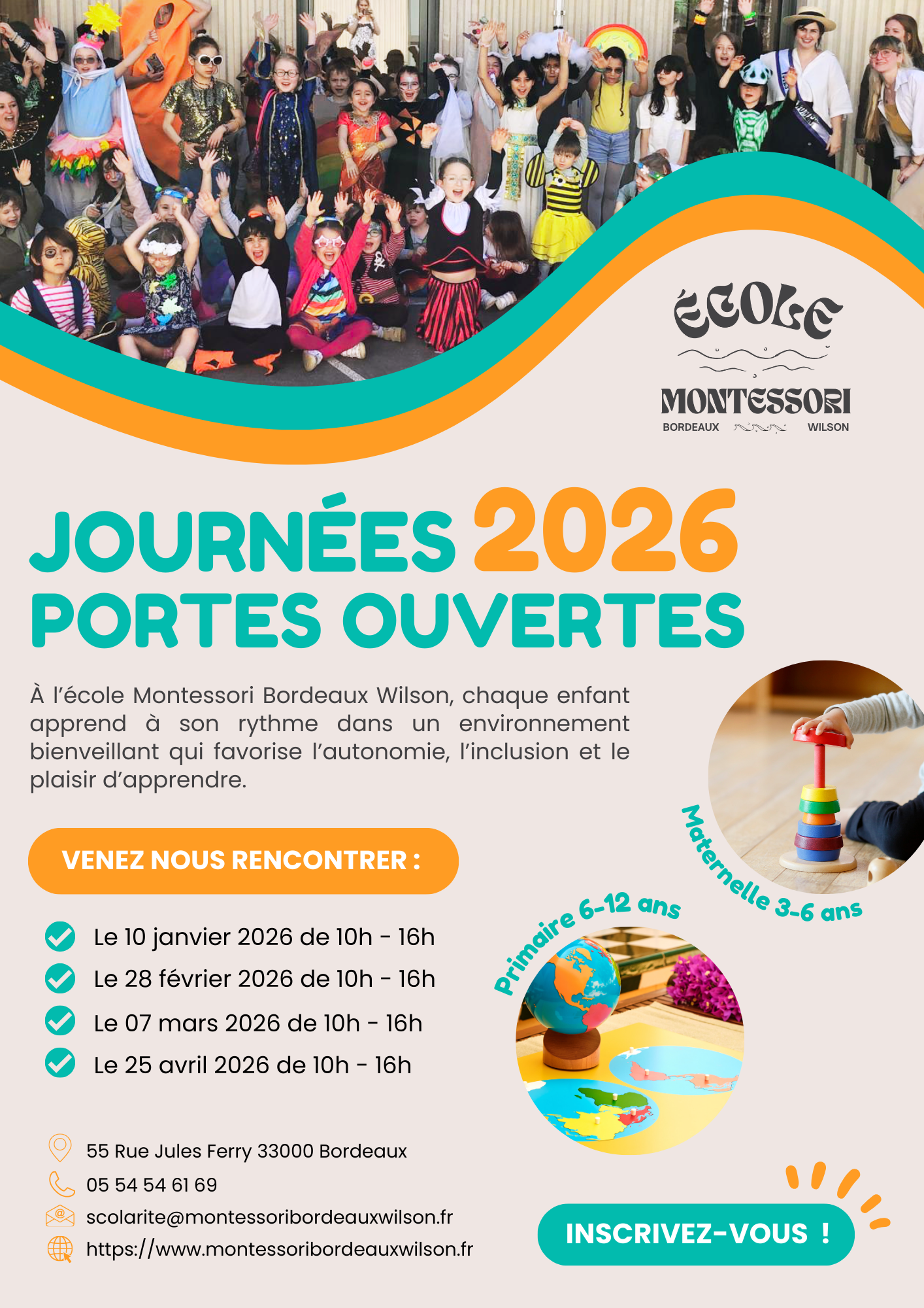 L'école privée montessori de Bordeaux Wilson a ouvert ses portes en 2012 avec une vision unique et un projet pédagogique centré sur l'enfant. Conscient qu'ils ont des aptitudes et des besoins spécifiques en fonction de leur âge, notre projet pédagogique est individualisé et répond aux spécificités de chacun.